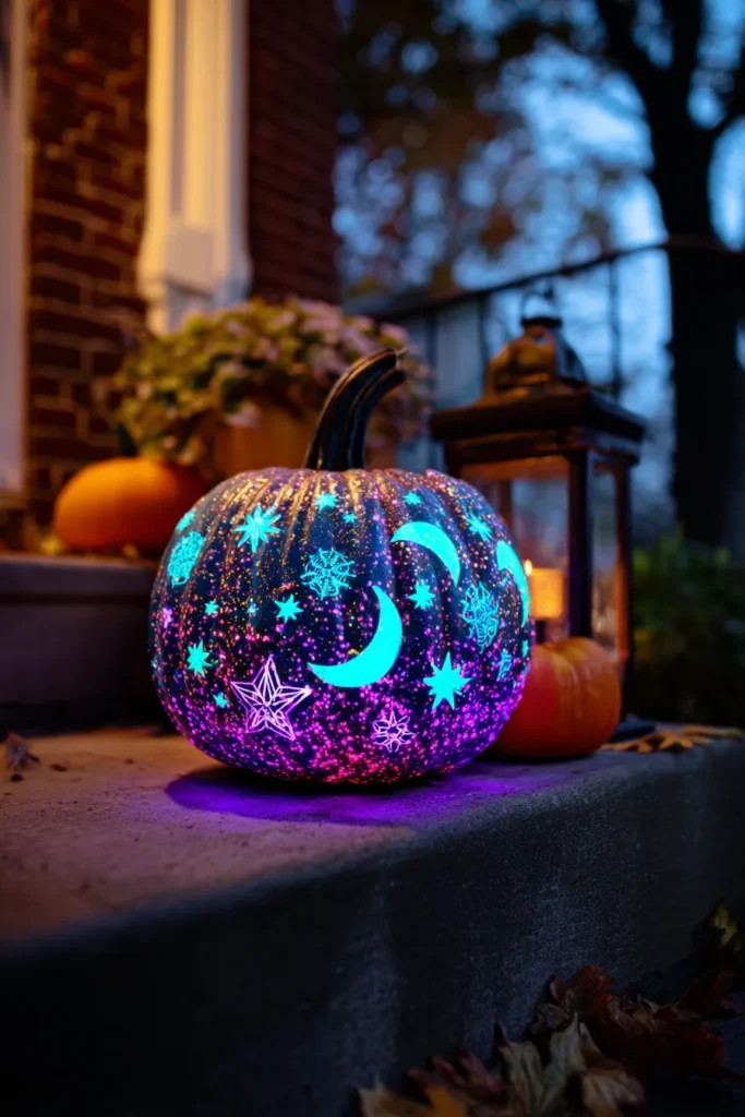 Painted with glowing moons and stars, this pumpkin lights up with a cosmic effect once the sun goes down. The neon blues and purples make it feel like a mini galaxy on the porch.