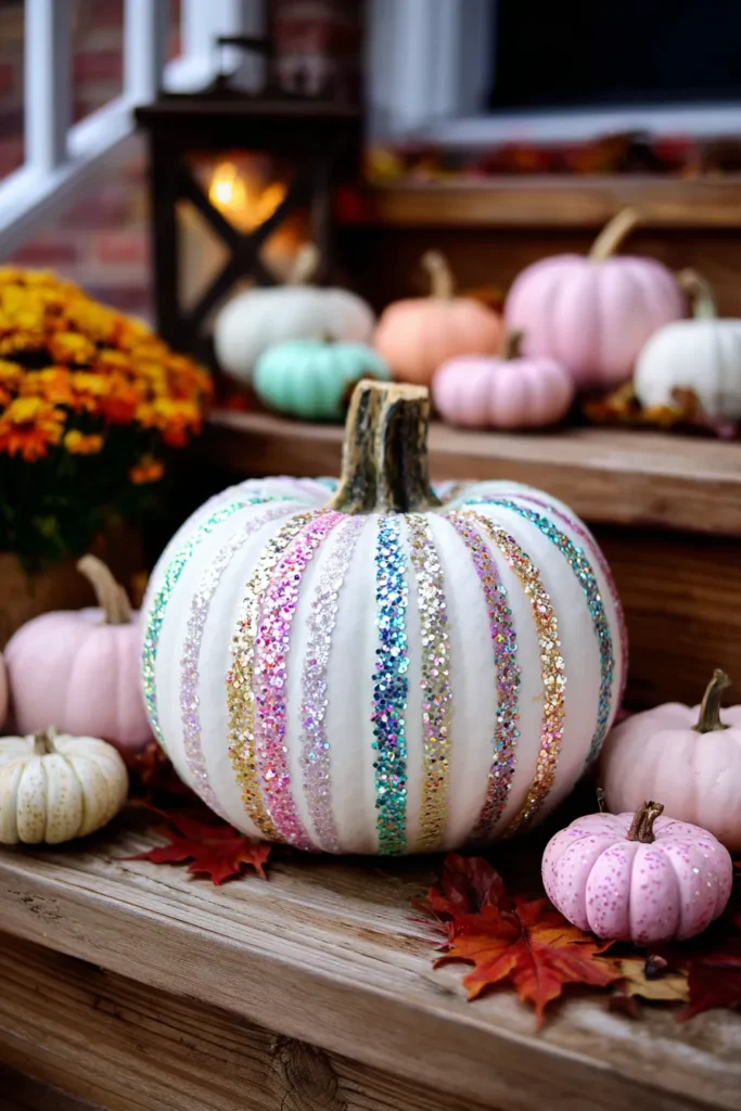 This pumpkin is dressed up in sparkling stripes of glitter running down a white base. Surrounded by smaller pastel pumpkins, it feels glamorous yet still fun and playful.