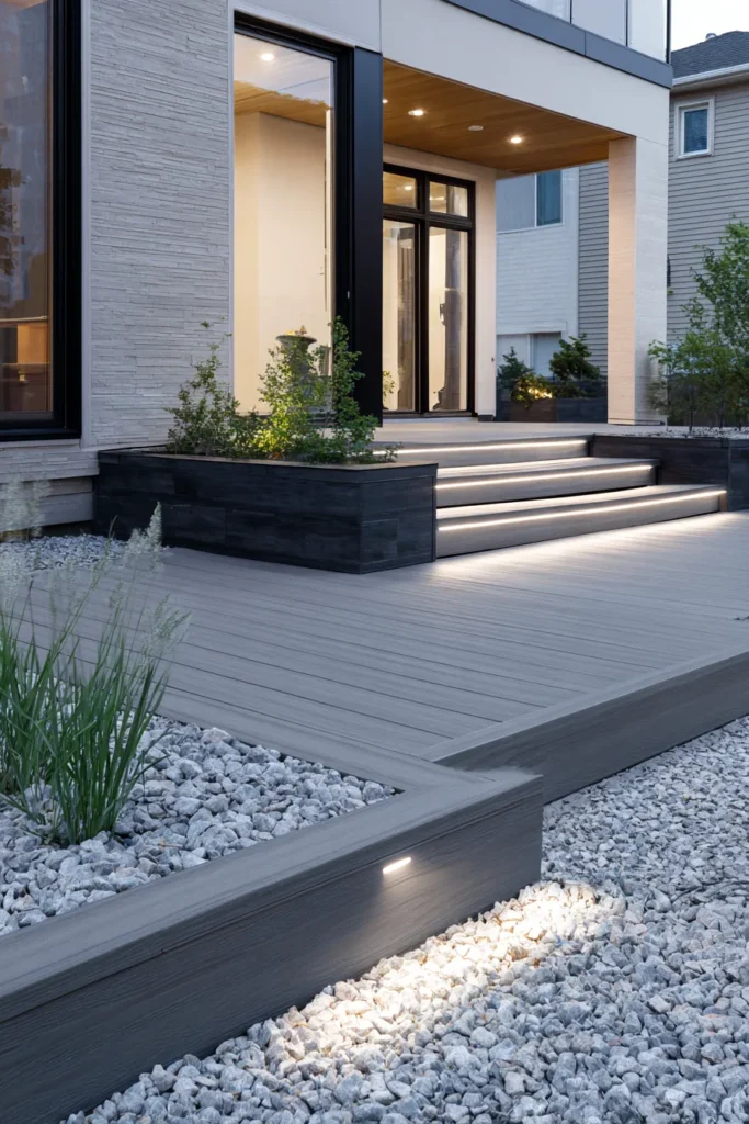 This deck features smooth concrete steps, light gravel accents, and a simple wood transition that leads toward the home. The materials are neutral and understated, allowing the architecture and landscaping to shine without distraction. Everything feels structured and intentional.