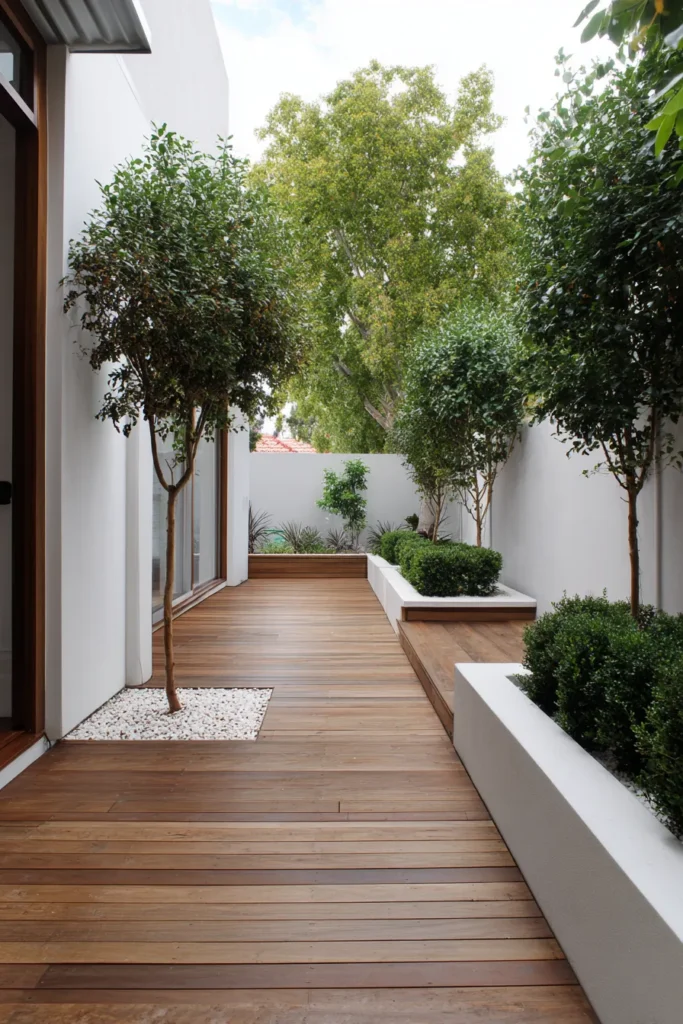 This minimalist deck runs along the side of the home with warm wood planks and clean white walls that keep everything feeling bright and open. Built in planters line the edges with soft greenery that adds life without overwhelming the space. The long layout creates a calm flow that feels intentional and uncluttered.