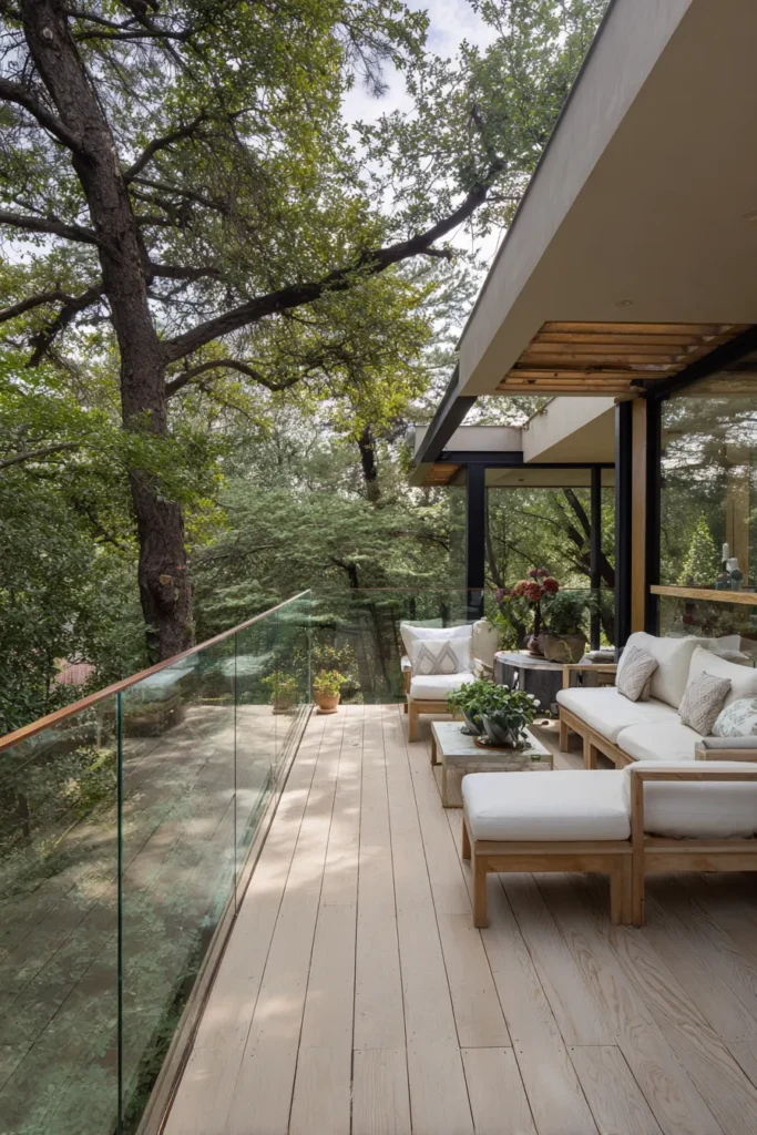 I find this setup so inviting because it feels protected yet connected to nature. The glass railing makes everything feel bigger and brighter. It is the kind of deck that feels perfect for slow afternoons and relaxed conversations.
