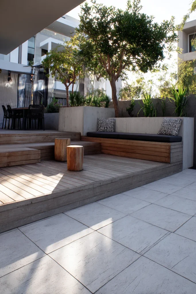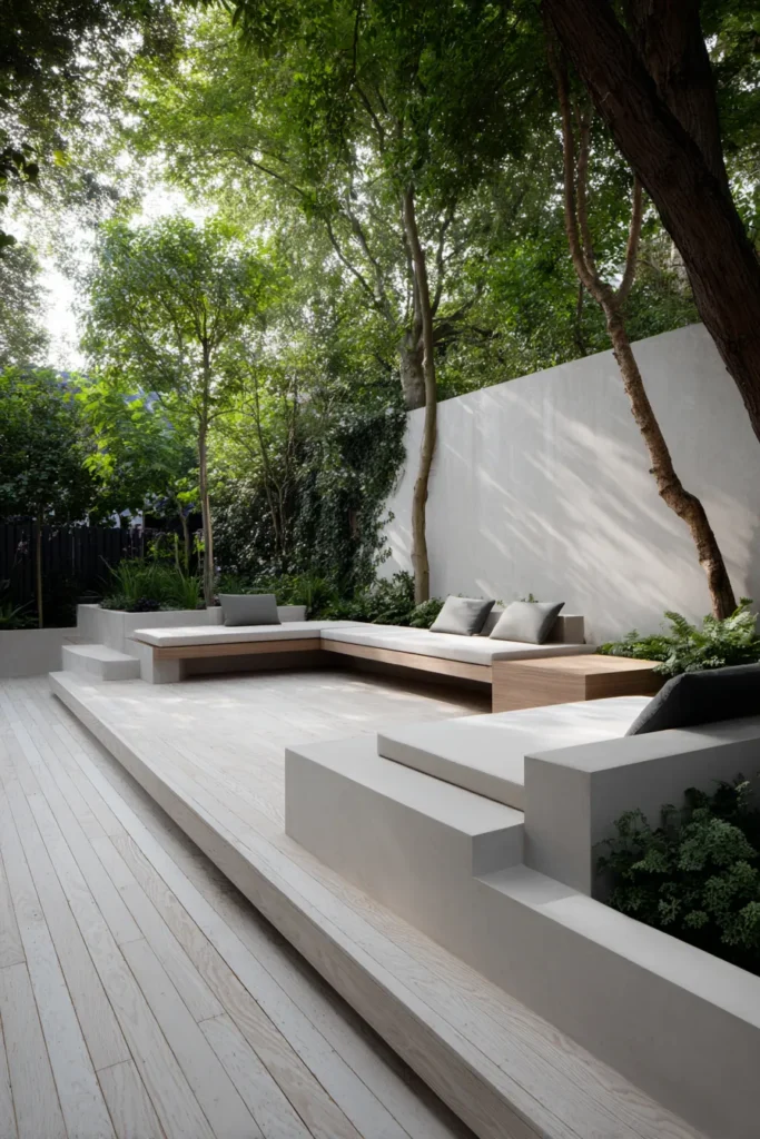 This minimalist courtyard deck combines light concrete flooring with warm wood benches built directly into the structure. Planters and small trees are placed with intention, keeping the layout clean and balanced. The design feels modern while still offering a sense of privacy in an urban setting.