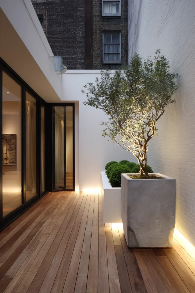 This deck uses warm wood planks paired with subtle integrated lighting along the base of the wall. A large sculptural planter adds a focal point while keeping the overall look minimal. The soft glow creates a calm evening atmosphere without overpowering the space.