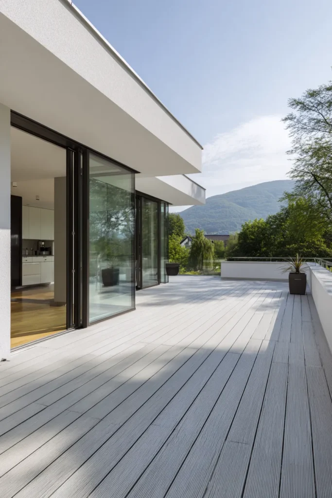 This minimalist deck stretches along the home with cool toned decking and expansive glass doors. The clean lines and open layout allow the surrounding landscape to shine. Nothing competes for attention which keeps the entire space feeling calm and grounded.
