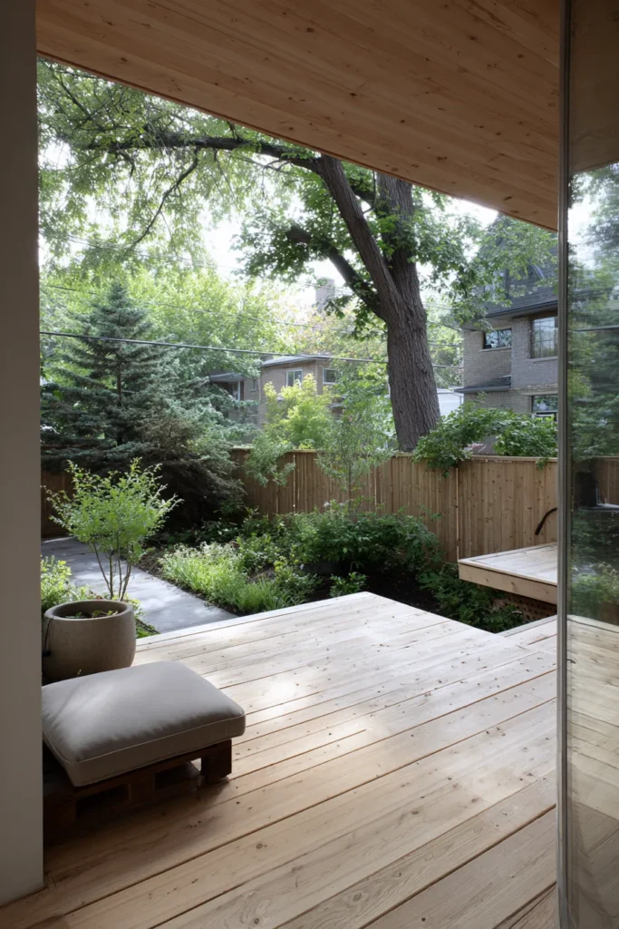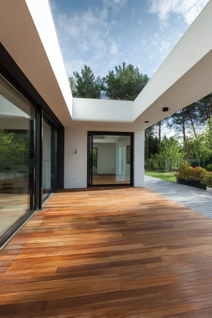 This minimalist deck stretches along the side of the home with warm wood flooring and an open ceiling that lets natural light pour in. Large glass doors blur the line between indoors and outdoors, while the design stays intentionally free of extra decor. Every element feels purposeful and clean.