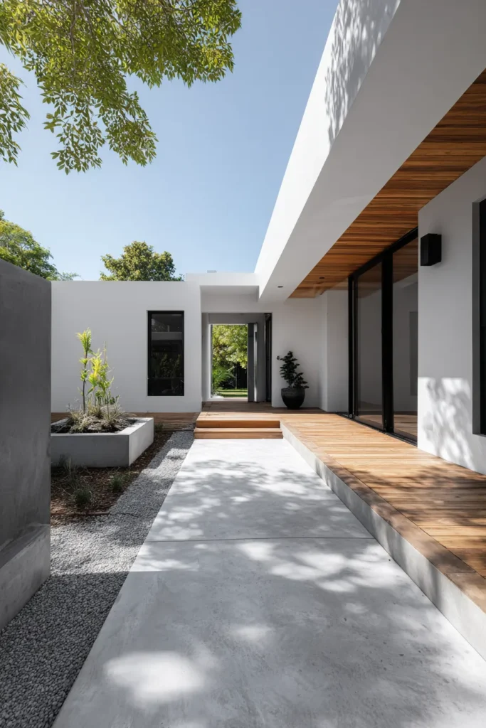 This deck blends smooth concrete pathways with warm wood sections that lead toward the home. White walls and simple planters keep the design fresh and uncluttered. The layout feels airy and well balanced from every angle.