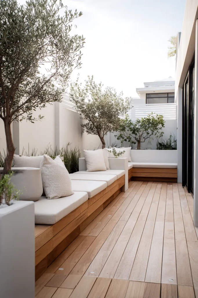 This minimalist deck features warm natural wood planks paired with clean white walls and a simple built in bench that feels both modern and inviting. The design keeps everything low and streamlined, letting the textures of the wood and soft outdoor cushions do the talking. Subtle greenery frames the space without overwhelming it, creating a calm and balanced outdoor nook.