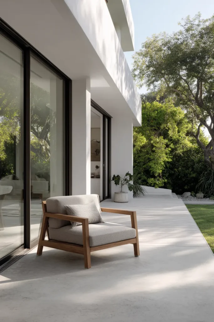 This deck combines smooth concrete flooring with a sleek modern facade and floor to ceiling glass doors. A single wooden lounge chair with neutral cushions sits quietly in the corner, leaving the space open and uncluttered. The surrounding greenery adds just enough softness to balance the crisp architectural lines.
