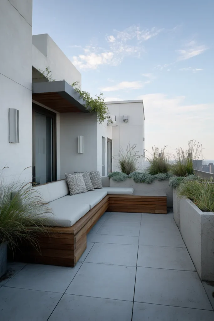 This small deck proves that minimalist design works beautifully in compact spaces. Light wood decking pairs with smooth concrete walls and a built in bench that doubles as seating and structure. A few carefully placed plants soften the look without crowding the space.