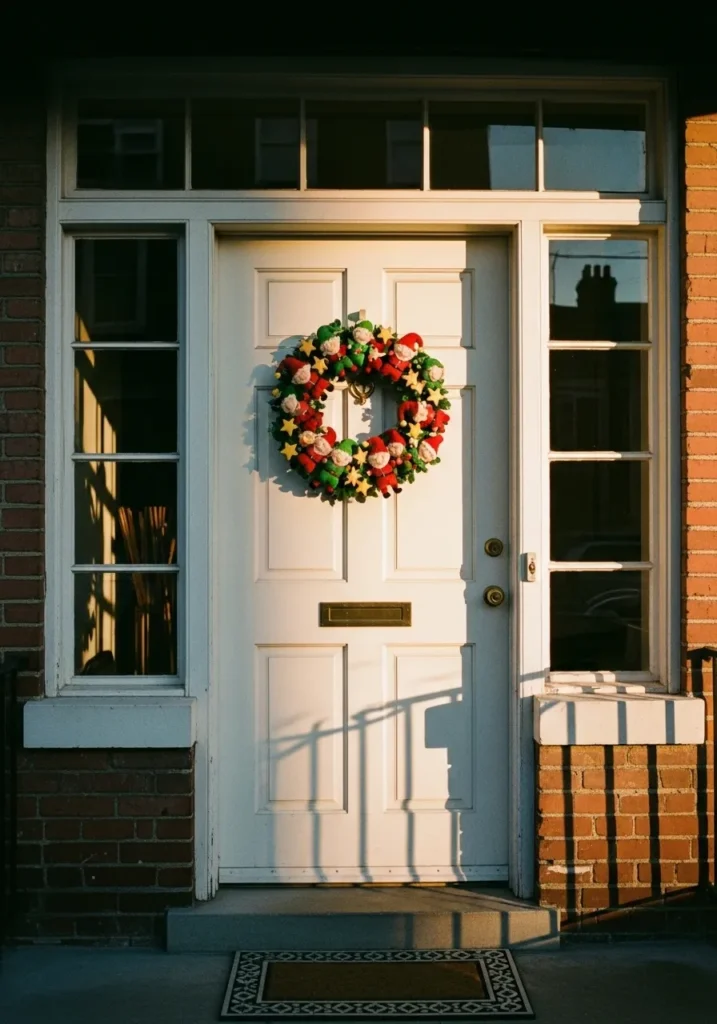 This wreath bursts with Christmas joy, featuring tiny felt Santas, bright stars, and pops of green and red that instantly bring a smile. Hanging proudly on a crisp white door framed by warm brick, it’s the kind of decor that makes any home look welcoming and full of holiday spirit.