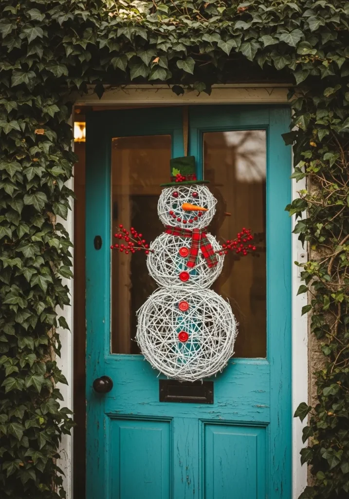 This clever design turns a simple wreath idea into a full snowman made of white twig circles, red buttons, and a tiny carrot nose. The bright teal door behind it makes the snowman look like he’s glowing with holiday cheer.
