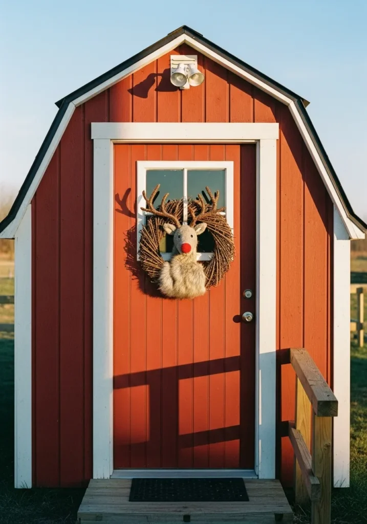 This wreath features a fuzzy reindeer head with soft antlers made of twigs and a big red nose that immediately makes you think of Rudolph. Hanging on a red barn-style door, it gives off the most charming rustic farmhouse feel.