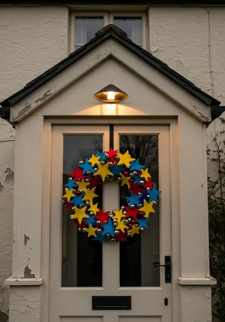 This wreath made of bright red, blue, and yellow stars feels bold and cheerful, almost like something from a festive cartoon. The soft cream door behind it lets the colors shine, creating a playful and lighthearted look.