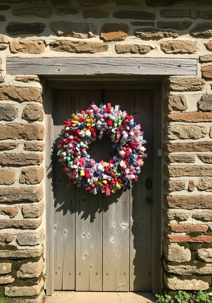 A wreath full of colorful fabric scraps looks charming against this weathered wooden door and stone walls. Each strip of fabric adds its own little pop of color, making it feel homemade and full of character.