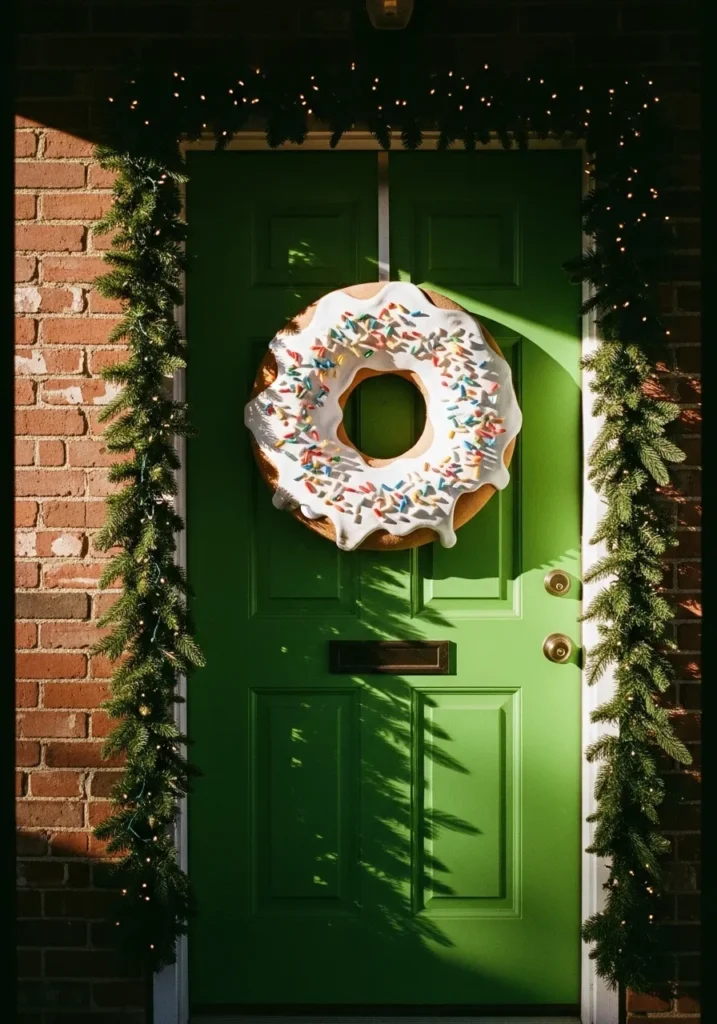 A donut-shaped wreath with white icing and rainbow sprinkles? It doesn’t get more whimsical than that. Hanging on a bright green door surrounded by garland, it looks playful, modern, and irresistibly fun.
