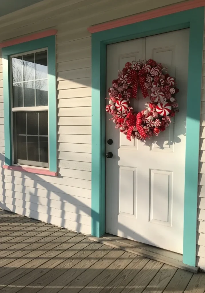 Red and white peppermint swirls mix with polka-dot ribbons to create a wreath that feels straight out of a candy shop. Hanging on a white door framed with turquoise and pink trim, it’s festive, colorful, and delightfully fun.
