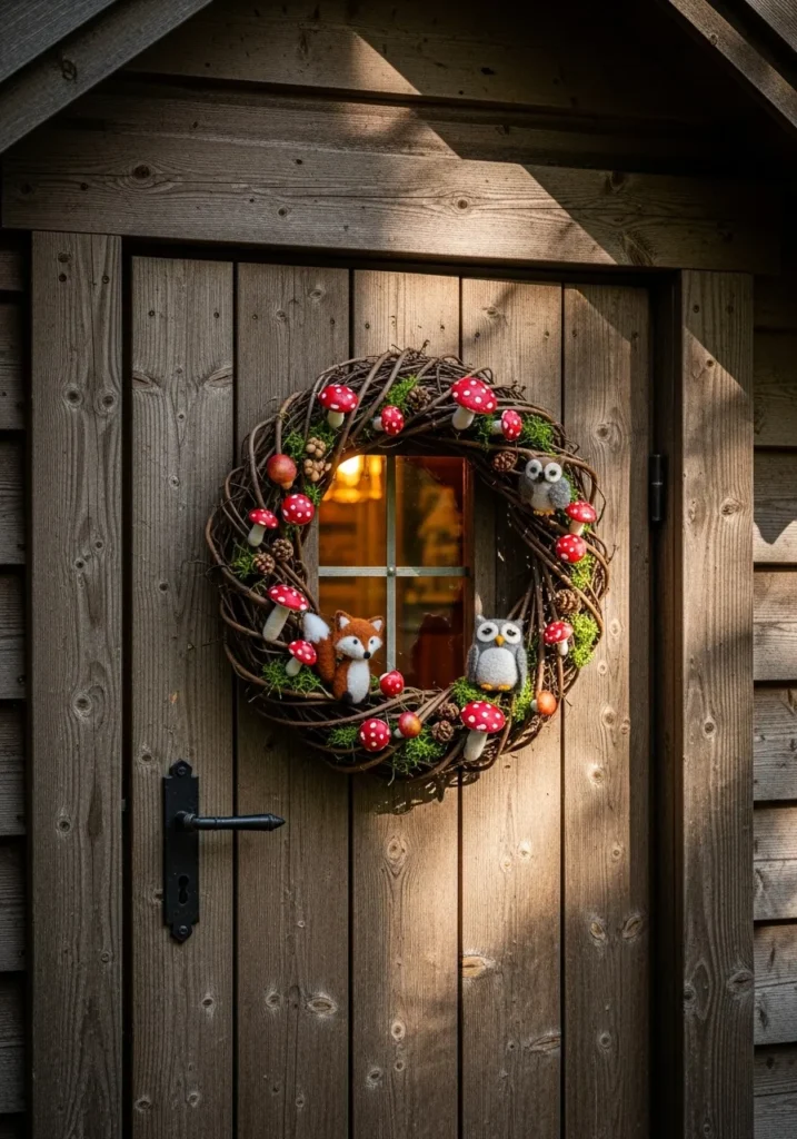 A charming wooden door sets the perfect backdrop for this wreath filled with adorable felt owls, a fox, and little red mushrooms. The mix of twigs, moss, and berries gives it a cozy woodland vibe that feels both whimsical and storybook-worthy.