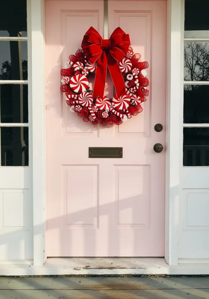 Red and white candy swirls, ribbon curls, and a giant bow make this wreath a sweet treat for the eyes. The soft pink door gives it a playful, modern twist that’s pure joy. It’s festive without taking itself too seriously, which makes it all the more fun.