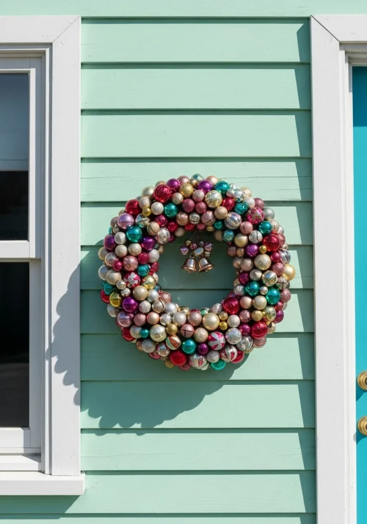 This wreath is a burst of color made from shiny ornaments in pink, gold, teal, and purple. Hanging on a mint-green house exterior, it feels fresh, cheerful, and impossible to ignore. The little jingle bells in the center add the perfect touch of holiday sparkle.