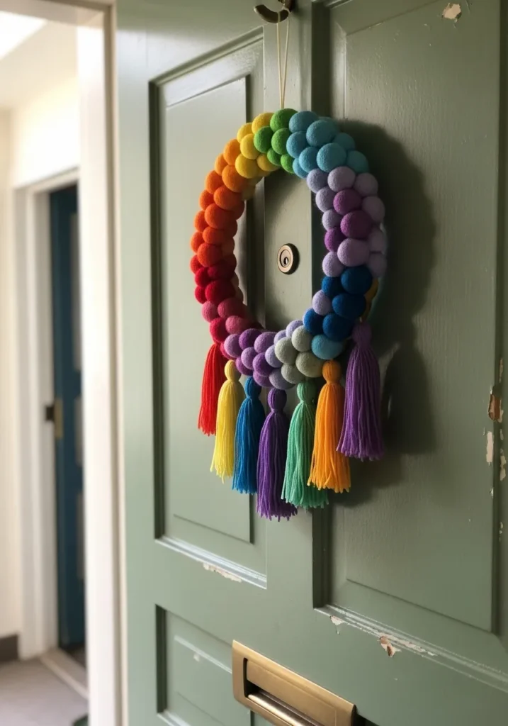 Soft felt balls in a gradient of warm rainbow colors create a cozy, cheerful wreath that stands out beautifully on a wooden door. The texture feels inviting, and the colors give off both warmth and happiness.