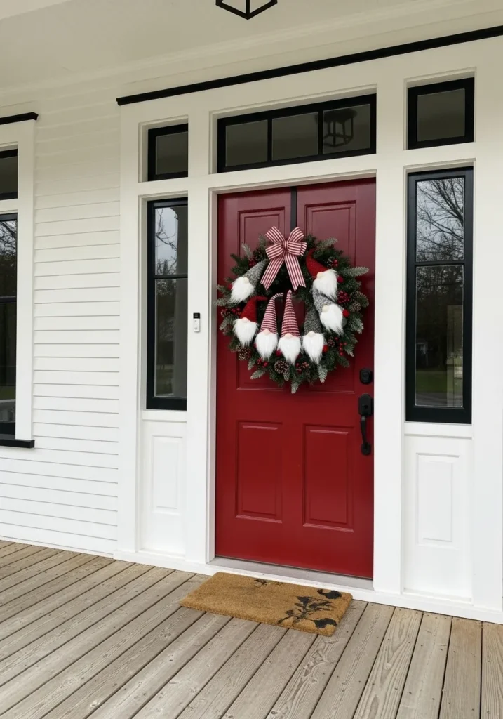 This wreath is pure Christmas charm with its trio of little gnomes wearing striped hats and fuzzy beards. The red and white palette feels perfectly festive against the bold red door, while pinecones and a striped bow add that classic Scandinavian touch. It’s playful, cozy, and just the right amount of quirky.