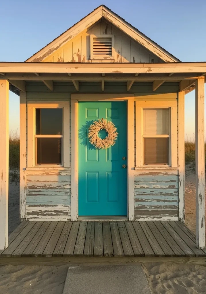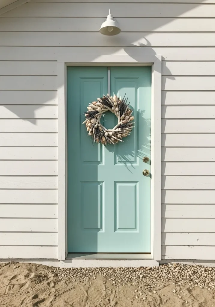 This wreath combines sun-bleached driftwood and pale seashells to create a natural, textured look. The arrangement feels light and airy, especially against the soft turquoise door. It’s coastal style in its most effortless form.