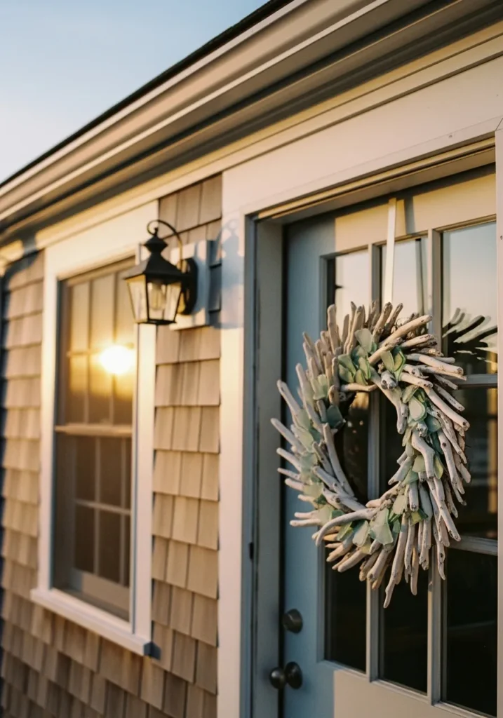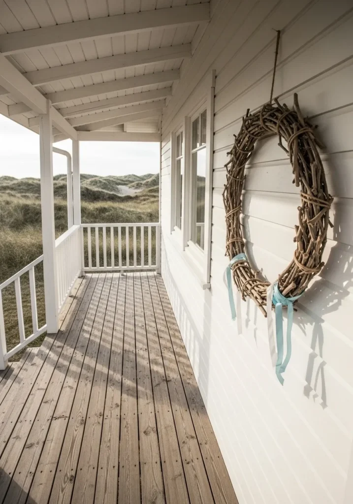This wreath made of twisted driftwood branches has an airy, organic feel that fits beautifully on the light porch wall. The soft blue ribbons tied at the bottom add a gentle coastal touch and make the whole piece feel delicate yet grounded.