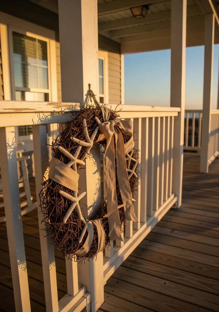 I adore how this wreath feels simple yet thoughtful. The starfish add just the right touch of coastal whimsy, and the ribbon gives it a soft, elegant finish. It’s one of those designs that make me want to sit on the porch with a cozy throw and watch the sunset.