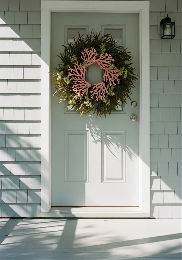 This coral-inspired wreath is a playful twist on classic coastal décor. The coral branches, painted in a soft pink hue, sit beautifully against a bed of greenery that gives it volume and texture. It’s a wreath that feels modern yet wonderfully connected to the sea.