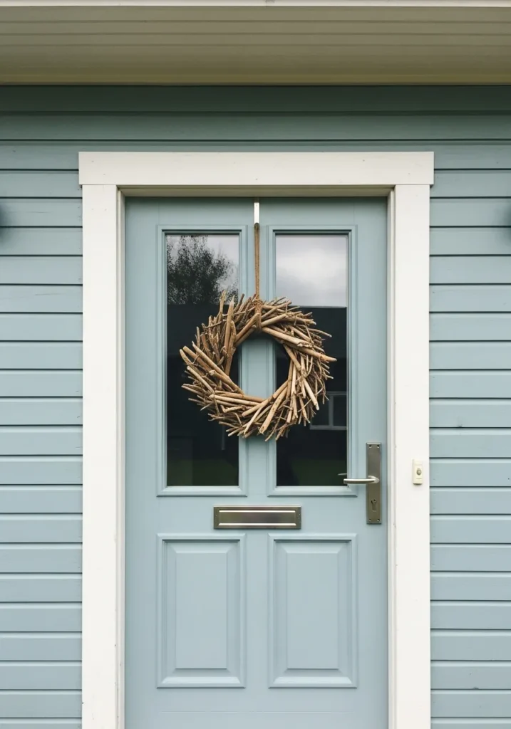 This wreath has that perfect windswept charm. It’s crafted entirely from natural driftwood pieces, giving it a sun-bleached, beach-walk feel that looks stunning against the muted blue door. The uneven branches give it a wild texture that makes it stand out beautifully in its simplicity.
