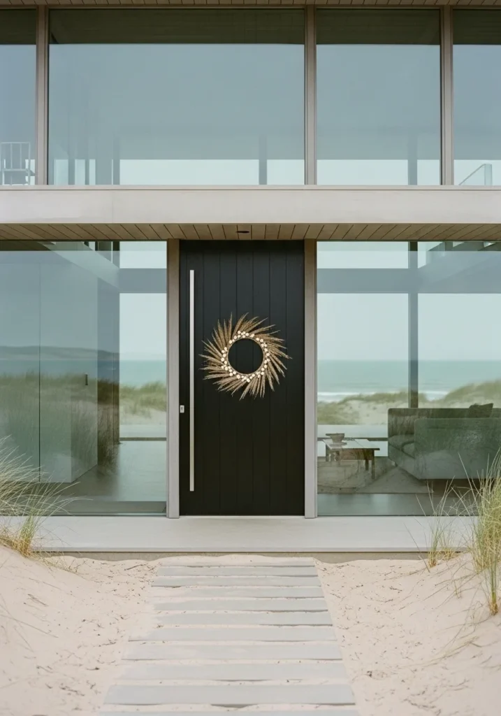 This wreath feels like modern beach minimalism done right. The design uses delicate golden reeds radiating outward, accented with tiny shells that shimmer softly against the black door. It’s sculptural, elegant, and beautifully understated, creating a focal point that still feels serene.