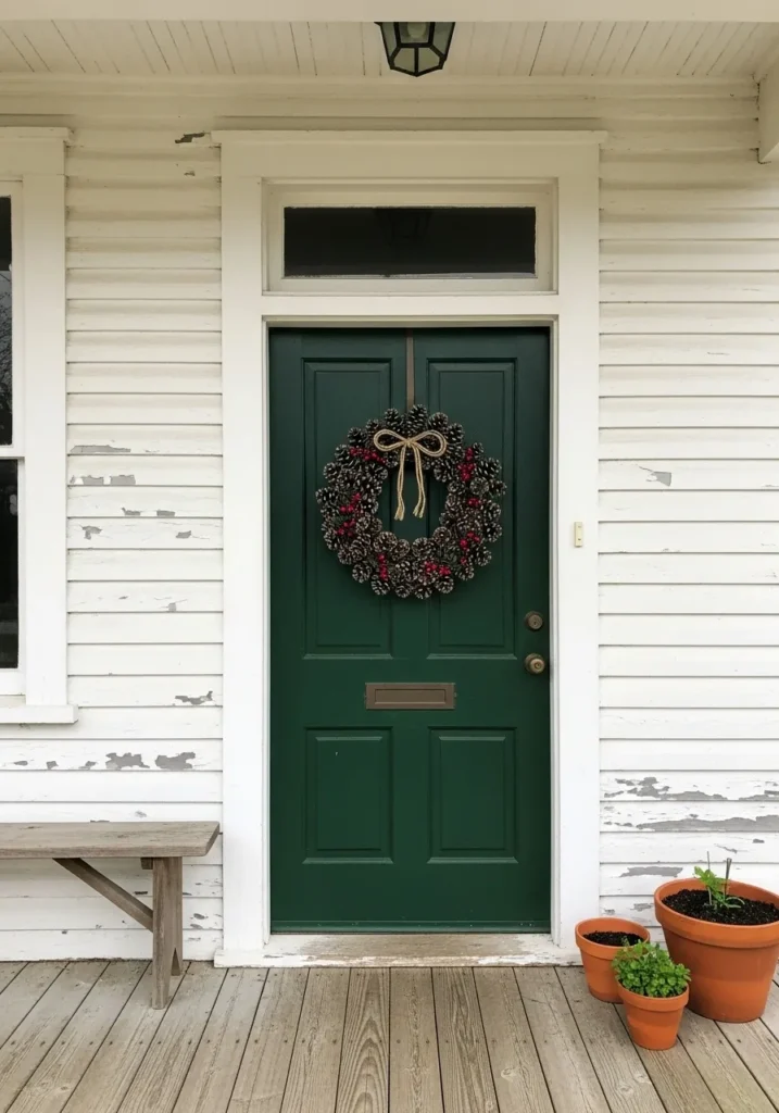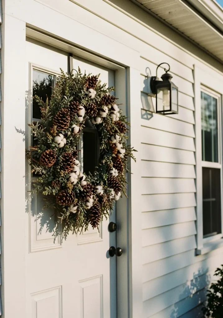 This wreath blends rustic pinecones with soft, fluffy cotton buds for a look that feels both elegant and cozy. The greenery is full and textured, giving it a natural woodland feel, while the cotton adds a touch of winter softness that looks stunning against the white door. It’s the perfect mix of organic materials that still feels polished and inviting.