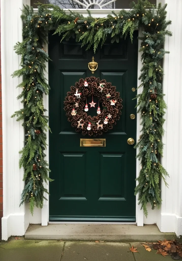 This cheerful wreath brings the fun of Christmas right to the doorstep. Made entirely from pinecones, it’s decorated with tiny figurines of Santa, reindeer, and stars that peek out between the cones. Surrounded by fresh evergreen garlands, it creates a classic, storybook holiday look that’s full of whimsy and joy.
