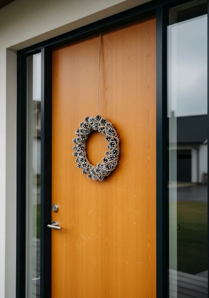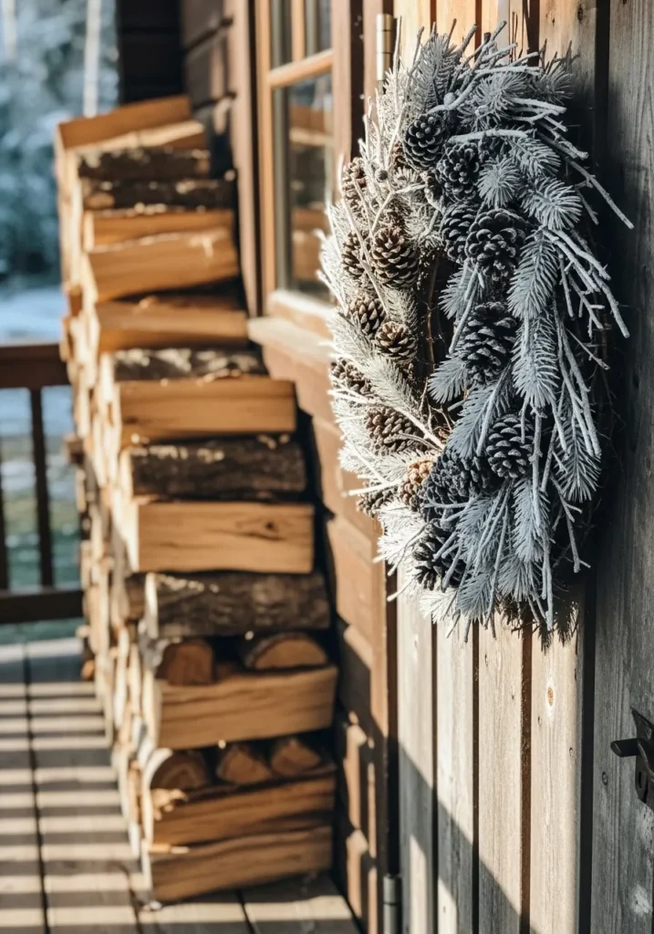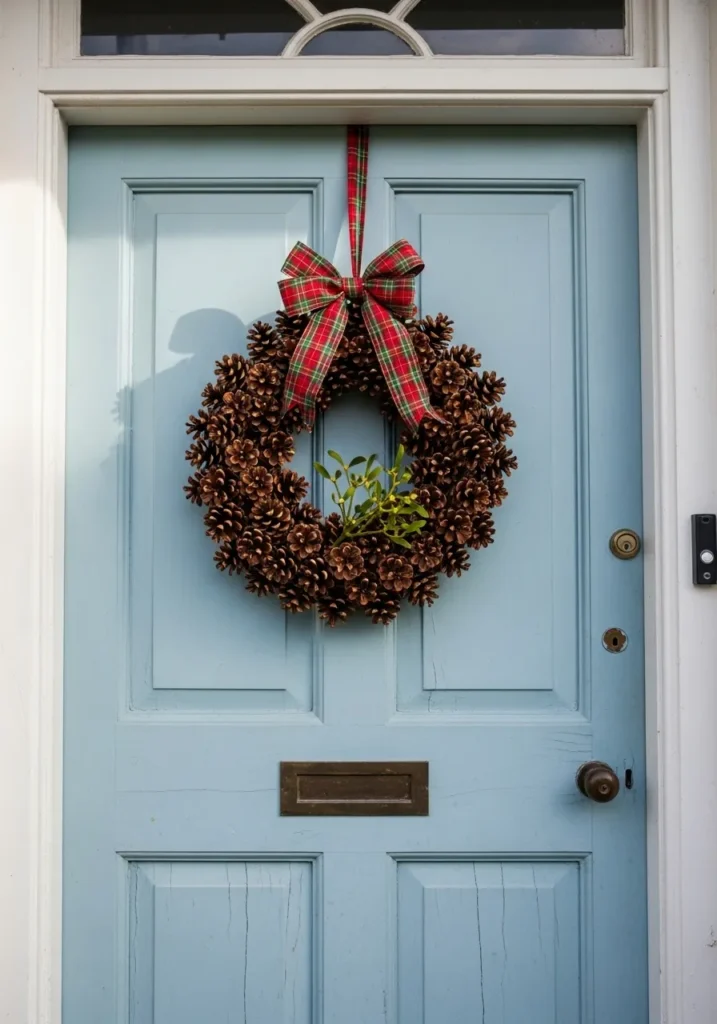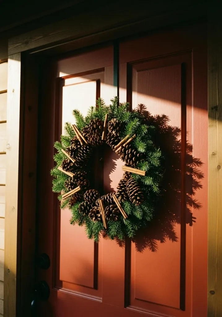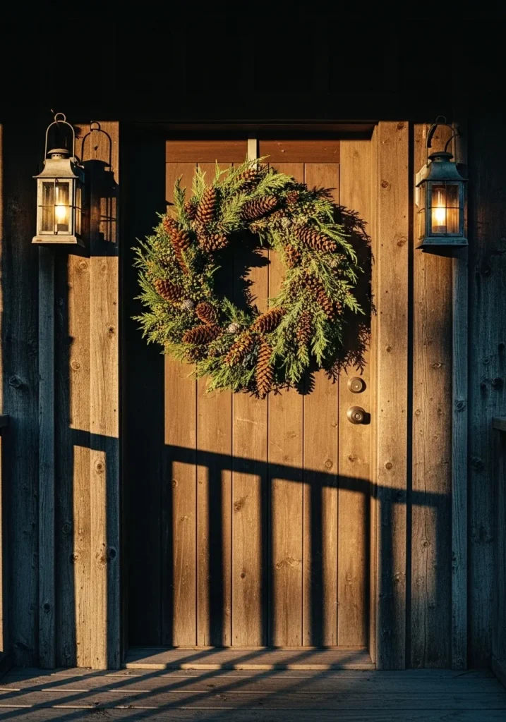 This design captures that cozy, cabin-in-the-woods feeling with a wreath made entirely of pinecones, fresh evergreen sprigs, and clusters of bright red berries. Hung on a warm-toned wooden door, the wreath feels like the perfect welcome for guests arriving on a crisp December evening. The mix of natural textures and earthy colors creates an inviting rustic charm that never goes out of style.