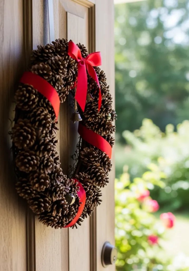 This wreath is a classic beauty with a pop of festive red. It’s made of small pinecones tightly packed together, wrapped with a bright red ribbon that winds around the wreath and finishes with a neat bow. The contrast between the deep brown cones and the ribbon makes it instantly eye-catching.