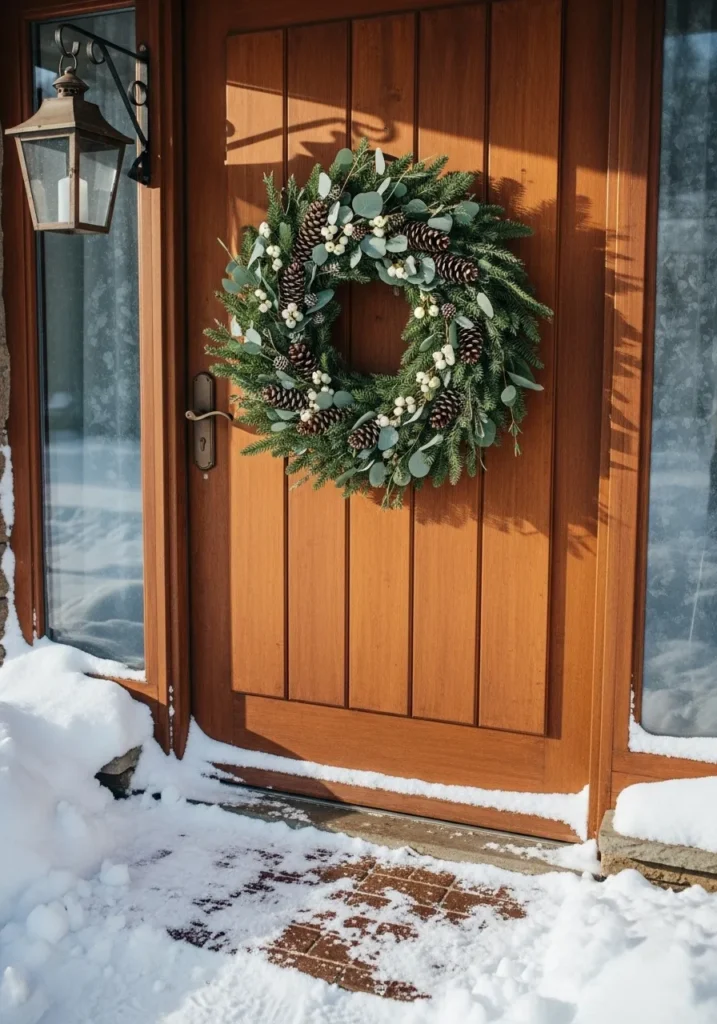 This wreath combines pinecones, soft evergreen branches, and silvery eucalyptus leaves to create a cool, natural winter look. Tiny white berries are sprinkled throughout, giving it a fresh, snow-kissed vibe that perfectly matches the snowy setting outside. It’s full, balanced, and feels straight out of a cozy mountain retreat.