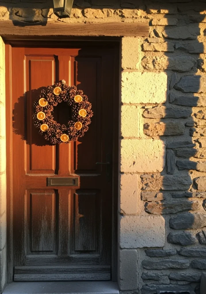 This design mixes rustic charm with a hint of festive spice. The wreath is crafted from chunky pinecones arranged in a perfect circle, accented with dried orange slices that bring a cheerful pop of color. The warm sunlight brings the oranges to life, making the whole wreath glow with a natural golden hue.