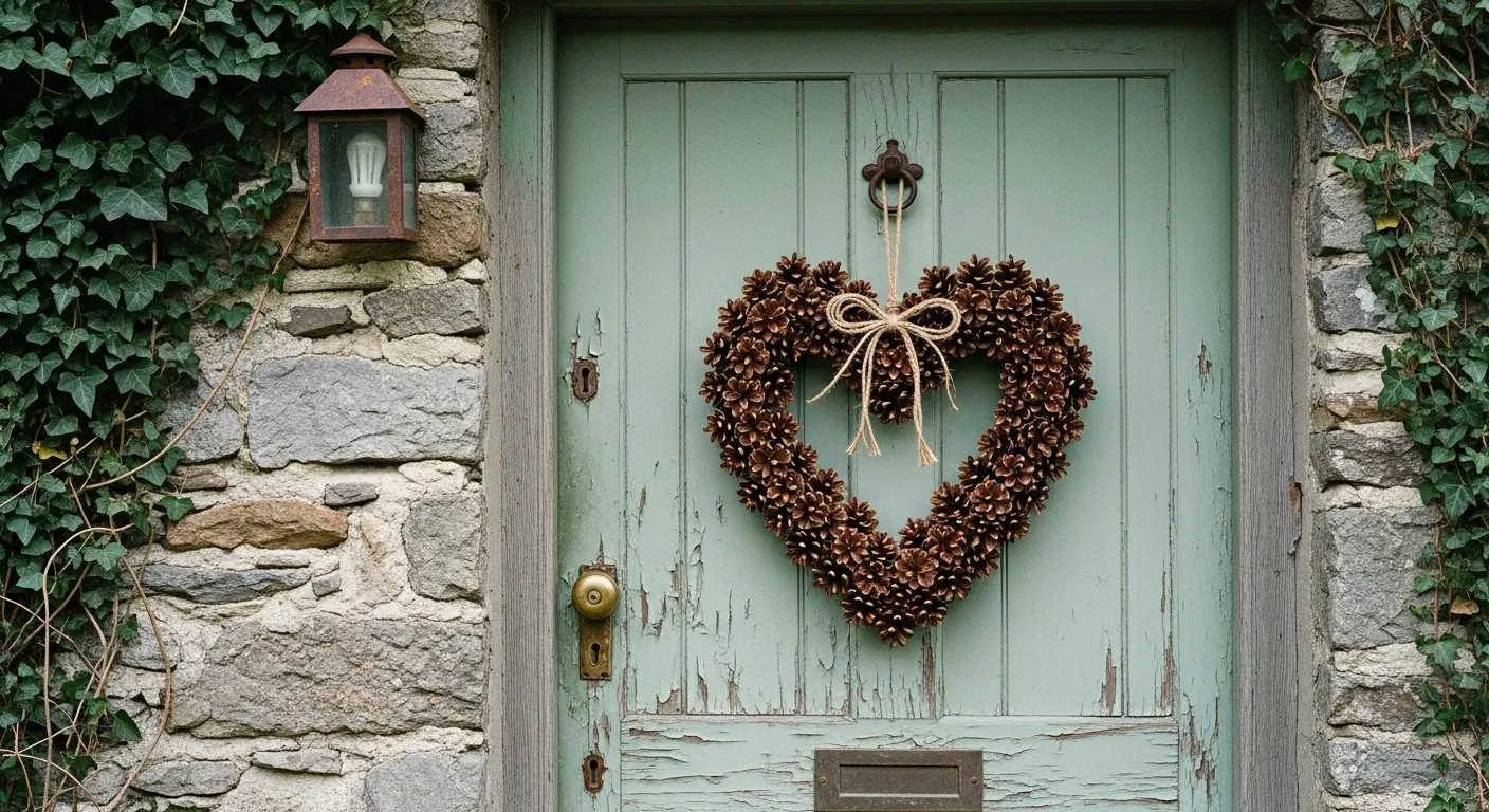This heart-shaped wreath is such a sweet take on the classic round design. It’s made from pinecones woven together with fresh evergreens and a simple twine bow at the top. The natural shape and soft textures make it feel full of warmth and personality, perfect for a cozy cottage door surrounded by ivy.