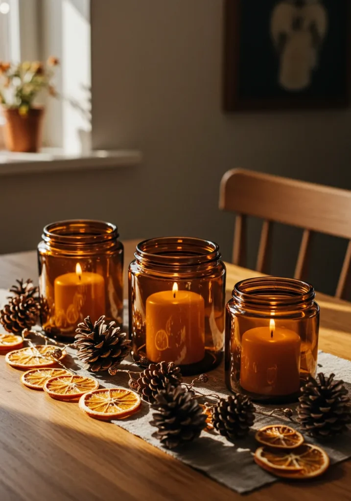 Three amber glass jars sit in a row, each holding a warm pillar candle that casts a soft golden light across the table. Around them, pinecones and dried orange slices add a rustic touch, their textures creating beautiful contrast against the smooth glass. The natural tones of brown, amber, and orange blend perfectly with the cozy wooden table beneath. Afternoon sunlight streams through the window, giving everything a gentle autumn glow.