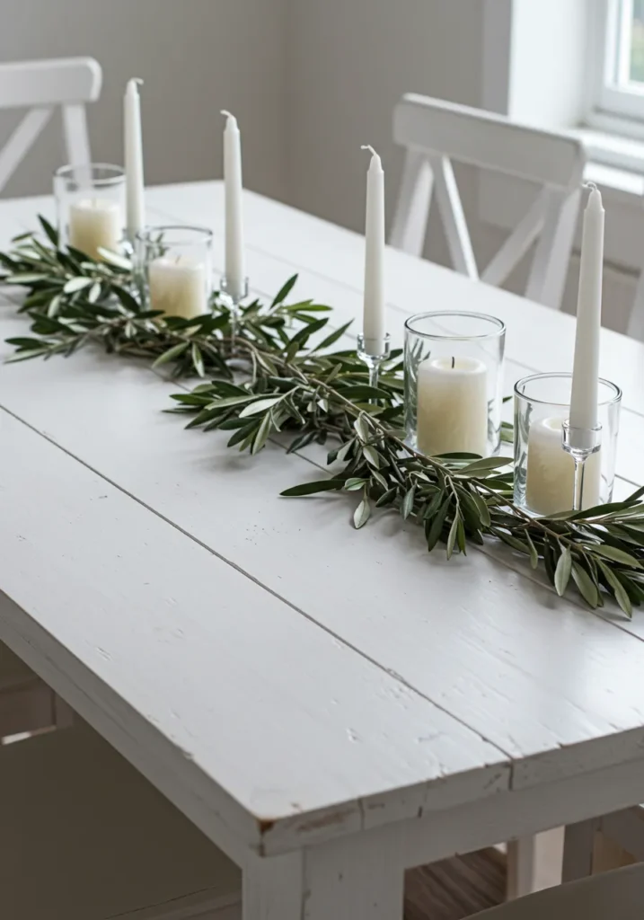 A white farmhouse table features a fresh olive branch garland, weaving through alternating glass candle holders and tall white tapers. The clean lines and soft tones create a peaceful, airy look that feels both modern and timeless. Sunlight from a nearby window makes the candles glow even before they’re lit, giving the space an effortless warmth.