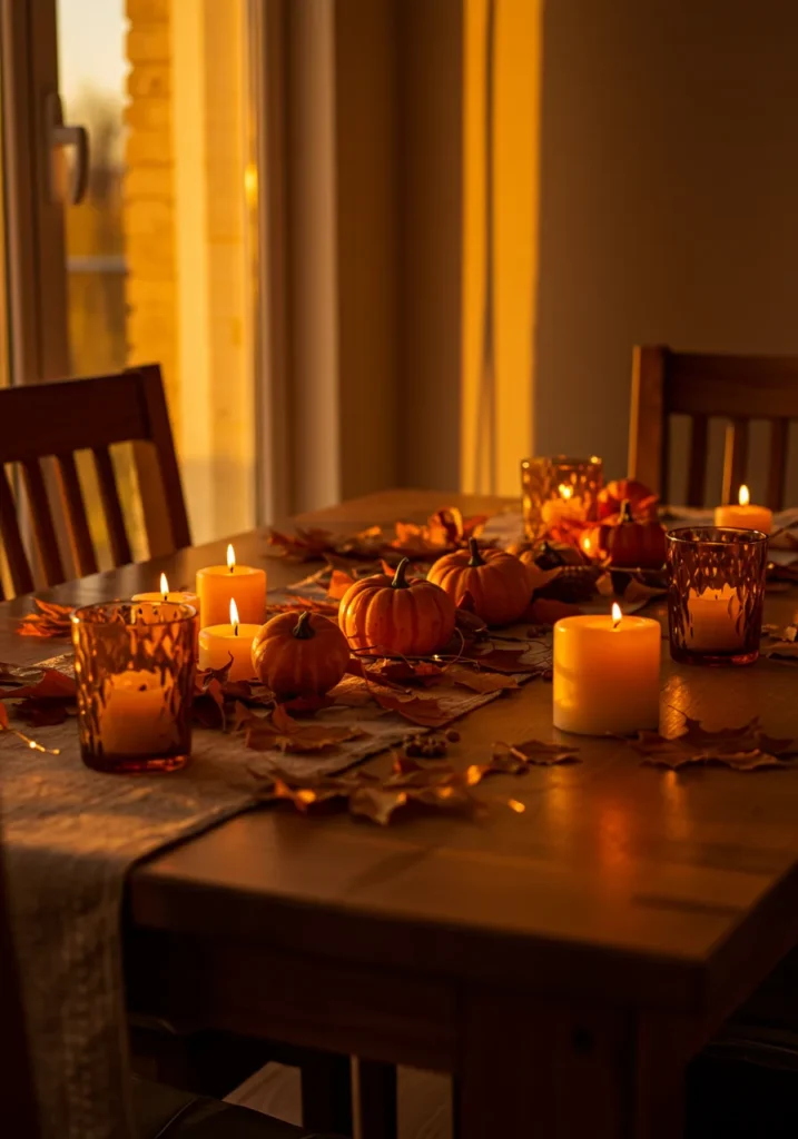 Soft candlelight spills across a wooden table lined with tiny pumpkins, amber glass votives, and scattered autumn leaves. The warm golden tones fill the space with a cozy sunset glow, making the entire scene feel like a warm hug. The flicker of each flame reflects beautifully against the rustic wood and deep orange decor, setting the perfect mood for an intimate Thanksgiving evening.