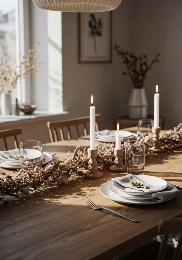 A light wooden table is dressed in simplicity, featuring white candles in wooden holders surrounded by a garland of dried flowers and tiny berries. The soft natural light from the window makes everything glow softly, creating a calm, minimal aesthetic that still feels festive. Every element feels intentional but never fussy, perfectly balanced between elegance and comfort.