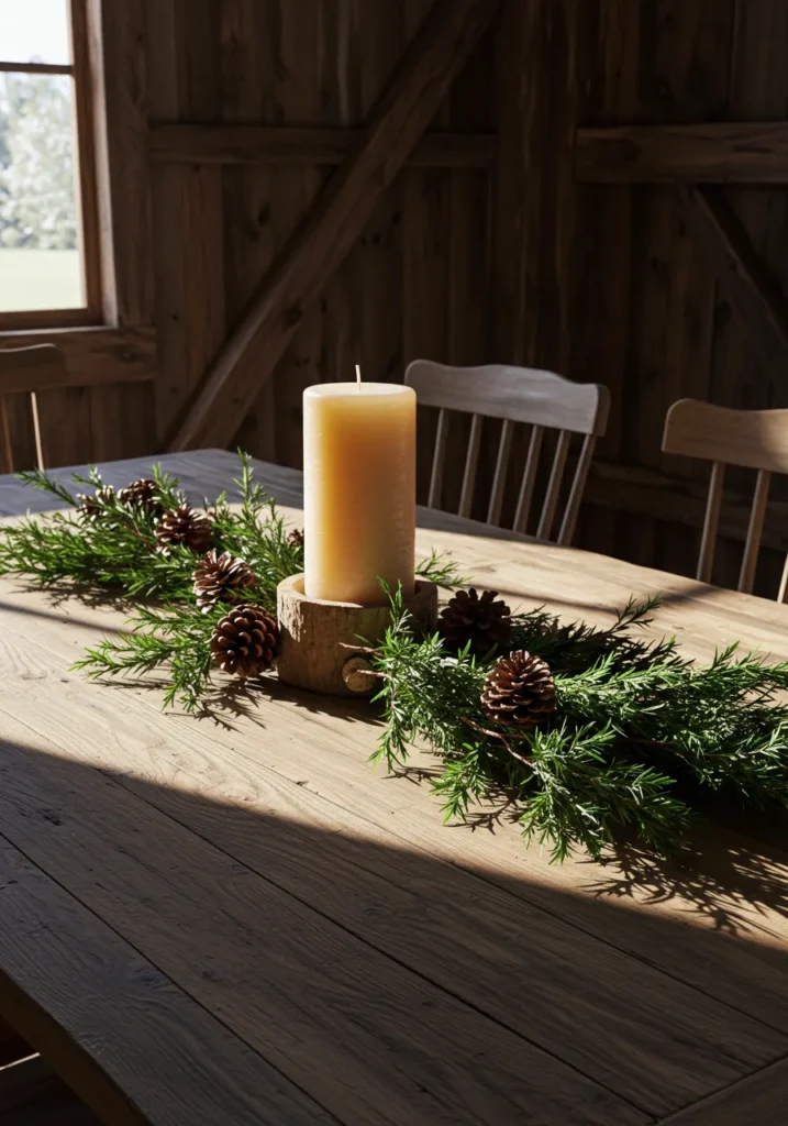 A single pillar candle sits proudly at the center of a reclaimed wooden table, surrounded by sprigs of evergreen and pinecones. The mix of rough textures, fresh greenery, and golden candlelight feels simple yet rich with character. Natural light pours through the window, highlighting the cozy, earthy tones of the wood and pine.