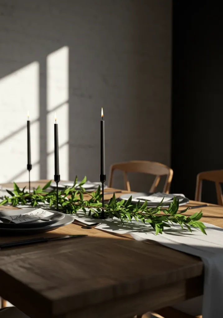 Sleek black taper candles rise from modern holders, paired with a fresh garland of bright green leaves running down the center of a wooden table. The clean lines and contrast between dark candles and greenery give it a chic, minimalist feel. Natural sunlight enhances the crisp tones, making the whole design feel fresh and current.