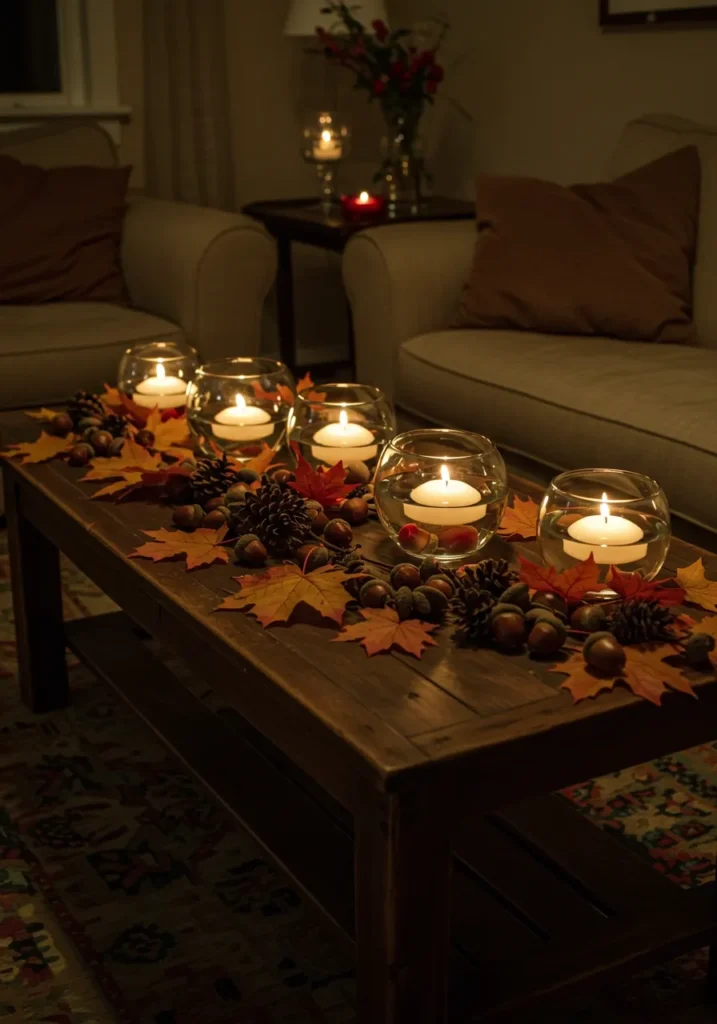 A wooden coffee table in a cozy living room glows under the light of floating candles set in round glass bowls. Scattered pinecones, acorns, and autumn leaves fill the space between, creating a warm and inviting display. The soft lighting bounces gently off the nearby sofa, turning the whole room into a snug autumn retreat.