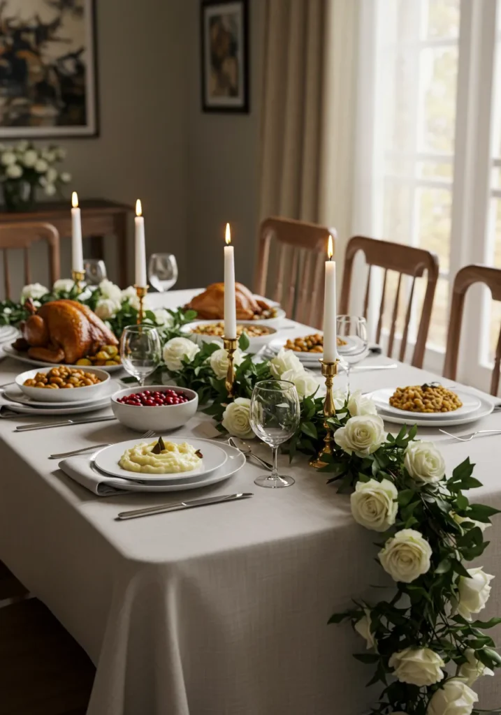 A long dining table dressed in soft ivory linen creates the perfect base for this elegant Thanksgiving setting. Lush white roses and greenery run down the center, intertwined with tall white taper candles in gold holders. The glow of candlelight reflects off the delicate glassware, while the surrounding dishes complete a timeless and refined look that feels both grand and inviting.