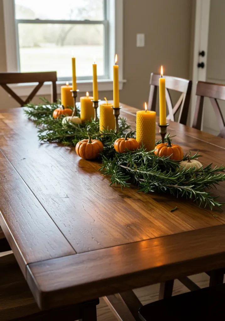 Golden beeswax candles rise above a garland of rosemary and tiny pumpkins, creating a vibrant centerpiece full of fall energy. The warm tones of yellow and orange blend perfectly with the rustic wood table, giving the setup a fresh yet earthy charm. The contrast of greenery and glowing candlelight makes the whole space feel cheerful and welcoming.