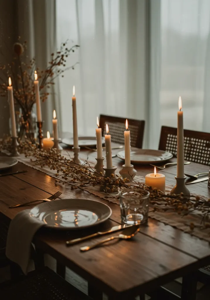 Some people go for bold centerpieces, but I love the quiet charm of natural textures mixed with soft candlelight. It’s elegant without trying too hard.