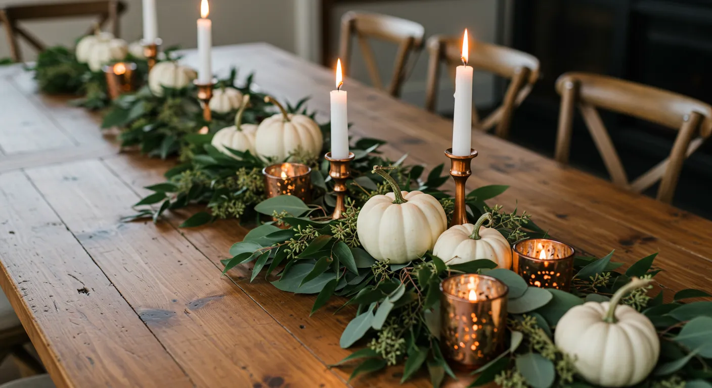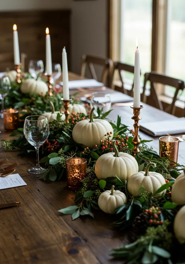 Soft white pumpkins nestle among sprigs of greenery and berries, surrounded by the golden glow of taper candles in copper holders. The mix of ivory tones, fresh foliage, and metallic accents strikes the perfect balance between classic and modern. The warm flicker of light gives the table a soft, welcoming feel.