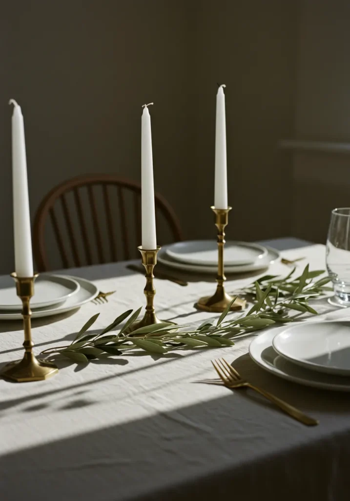 Three slim white taper candles stand tall in brass holders, their polished shine catching the light beautifully. A simple olive branch garland weaves between them, its muted green leaves complementing the soft cream tablecloth. The scene feels calm and refined, with just enough glow to set a cozy mood without overpowering the table.